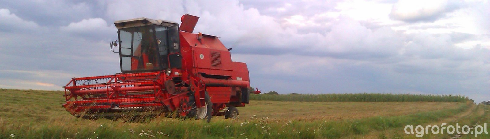 Kombajn Bizon Rekord podczas prac żniwnych na polu zboża. Widoczna charakterystyczna czerwona konstrukcja maszyny wskazuje na popularny model produkcji polskiego producenta Bizon, znany ze swojej niezawodności w średniej wielkości gospodarstwach rolnych. Kombajn wyposażony jest w heder z motowidłami, co sugeruje jego użycie przy koszeniu zbóż, takich jak pszenica czy jęczmień. Silnik o mocy 150 KM zapewnia wystarczającą siłę napędową do efektywnej pracy na polu, a pojemność zbiornika ziarna wynosząca 3 600 litrów pozwala na długi czas żniw bez potrzeby częstego przerywania pracy. Maszyna ta, ze względu na swoją konstrukcję i parametry, jest optymalnym rozwiązaniem dla efektywnych i wydajnych zbiorów w zróżnicowanych warunkach terenowych.