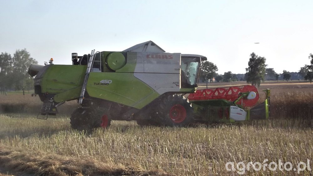 Kombajn Claas Tucano 450 podczas żniw zbóż na polu. Wyposażony w heder z motowidłami, model ten realizuje koszenie przy użyciu silnika Mercedes-Benz o mocy około 299 KM, co zapewnia wydajność i ciągłość pracy na rozległych areałach. System omłotu APS Hybrid zapewnia efektywne oddzielanie ziarna, minimalizując straty podczas zbiorów. Maszyna posiada zbiornik o pojemności około 9 000 litrów, co umożliwia długą pracę bez potrzeby częstego opróżniania. Charakterystyczna zielona kolorystyka i nowoczesna konstrukcja kabiny podkreślają innowacyjny design tego modelu.