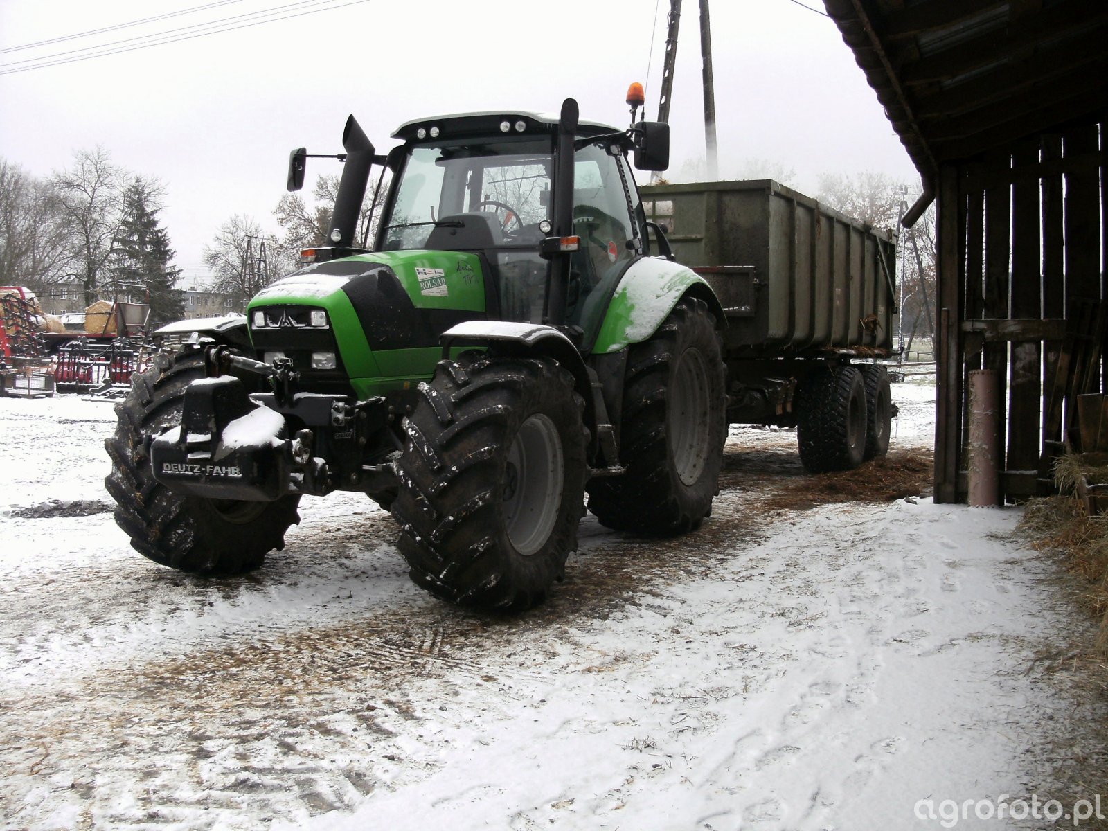 Ciągnik Deutz-Fahr TTV 610 stoi na placu gospodarstwa, przygotowując się do wywozu obornika. Wyposażony w silnik Deutz AG z sześcioma cylindrami i pojemnością skokową 6.1 litra, dostarcza moc 165 KM, co czyni go idealnym do wymagających zadań transportowych. Bezstopniowa skrzynia biegów TTV zapewnia płynną regulację prędkości, co jest nieocenione podczas precyzyjnego manewrowania z przyczepą skorupową. Współpraca z przyczepą podnosi efektywność pracy i pozwala na szybki transport materiałów organicznych. Traktor jest doskonałym przykładem nowoczesnej myśli inżynieryjnej, integrując zaawansowane technologie z codzienną pracą w rolnictwie.