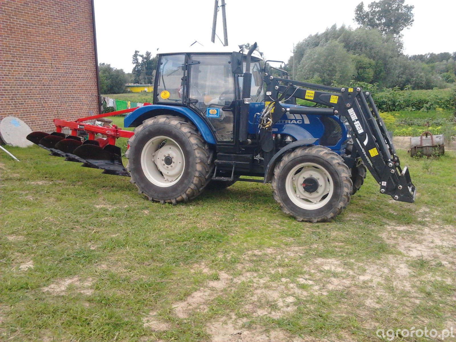 Ciągnik Farmtrac 690 DT z napędem na cztery koła manewruje na placu gospodarstwa, wyposażony w ładowacz czołowy Metal-Fach i współpracujący z pługiem 4-skibowym. Model ten o mocy około 90 KM, napędzany czterocylindrowym silnikiem Perkins, efektywnie operuje w różnych warunkach rolniczych. Średnia pojemność skokowa rzędu 3,3 litra oraz mechaniczna skrzynia biegów zapewniają płynność i precyzję pracy. Wydajność ciągnika w połączeniu z płozem korzystnie wpływa na jakość orki, umożliwiając głęboką penetrację gleby i dokładne odwrócenie skiby, co sprzyja lepszemu przygotowaniu pola pod uprawy.