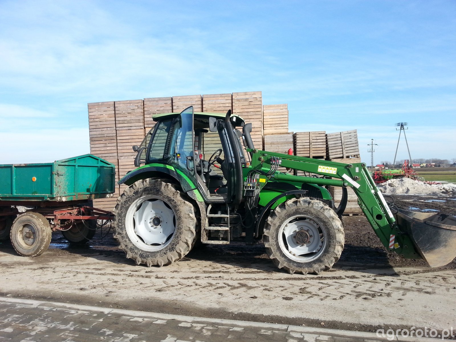 Ciągnik Deutz-Fahr 110 uchwycony na placu gospodarstwa rolniczego podczas załadunku przyczepy. Wyposażony w wydajny silnik o mocy 110 KM, ten model zapewnia solidne wsparcie w pracach rolniczych. Silnik Deutz o konstrukcji czterocylindrowej i pojemności 4.0 L gwarantuje efektywne i ekonomiczne działanie. Skrzynia biegów, typ mechaniczny z przekładnią 12/12, umożliwia precyzyjne dostosowanie prędkości do aktualnych potrzeb, co jest niezbędne podczas manewrowania z ładowaczem czołowym. Ciągnik doskonale współpracuje z przyczepą rolniczą, stając się kluczowym elementem w codziennych zadaniach przewozowych i transportowych w gospodarstwie. Dzięki wspomnianym parametrom ten model odznacza się zarówno wszechstronnością, jak i sprawnością w różnorodnych pracach polowych.