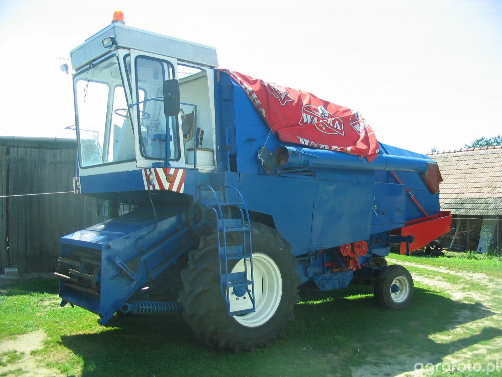 Kombajn Fortschritt E-512 przygotowany do pracy na gospodarstwie. Ten model, charakteryzujący się niebieską konstrukcją i wysoką kabiną, jest typowym przedstawicielem niemieckiej inżynierii rolniczej z lat 70. i 80. Wyposażony w silnik o mocy około 105 KM, jest przeznaczony do koszenia zbóż dzięki zamontowanemu hederowi z motowidłami, co pozwala na efektywne zebranie ziarna z pola. Pojemność zbiornika na ziarno wynosi 3 000 litrów, co umożliwia dłuższą pracę bez konieczności częstego opróżniania. Maszyna znajduje się na placu gospodarstwa, co sugeruje krótką przerwę techniczną lub przygotowania do nadchodzących żniw. Dzięki solidnej konstrukcji i sprawdzonemu systemowi młócącemu, Fortschritt E-512 pozostaje popularnym wyborem wśród rolników ceniących niezawodność i prostotę obsługi.