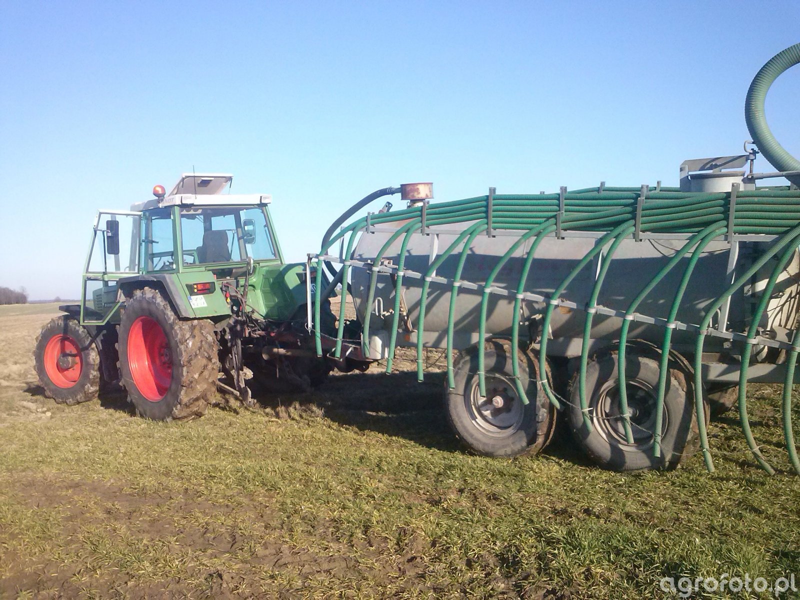 Ciągnik Fendt 312 LSA pracuje na polu, współpracując z wozem asenizacyjnym. Wyposażony w silnik o mocy 110 KM, zasilany przez 6-cylindrowy, 6-litrowy silnik MWM, skutecznie realizuje zadania nawożenia. Mechaniczna skrzynia biegów 12/12 daje pełną kontrolę operatorowi podczas precyzyjnej pracy, wpływając na efektywność operacji polowej. Rozwiązania zastosowane w Fendt 312 LSA umożliwiają wydajne zarządzanie zadaniami, co jest kluczowe w codziennych wyzwaniach rolniczych. Długotrwała współpraca z wozem asenizacyjnym pokazuje wszechstronność i wytrzymałość tego modelu podczas intensywnego użytkowania.