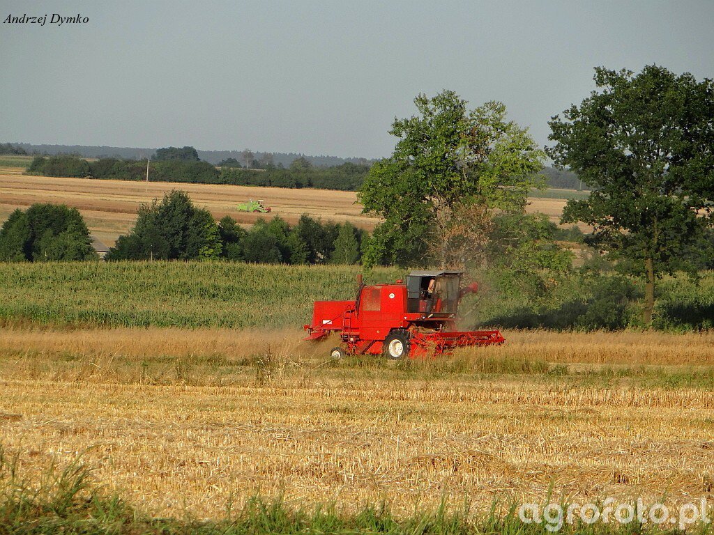 Kombajn Bizon Super Z056 podczas prac żniwnych na polu zboża. Ten charakterystyczny czerwony model jest wyposażony w heder z motowidłami, co jednoznacznie wskazuje na koszenie zbóż. Maszyna jest napędzana sześciocylindrowym silnikiem Perkins o mocy 100 KM, który zapewnia wystarczającą moc do pracy na dużych areałach. Bizon Z056 posiada bębenowy system omłotu z szerokością hedera wynoszącą 4,2 m, co umożliwia efektywne zbieranie plonów. Zbiornik ziarna o pojemności 2 100 litrów pozwala na nieprzerwaną pracę, minimalizując czas potrzebny na jego opróżnianie. Kombajn porusza się po otwartym, rozległym polu, a w tle można dostrzec różnorodny krajobraz uprawny, co podkreśla jego zdolność do pracy w różnorodnych warunkach polowych.