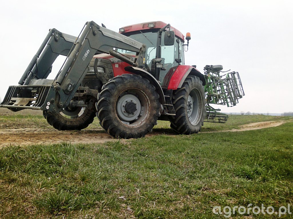 **Tytuł:** McCormick i Bomet **Kategoria:** McCormick **Tagi z systemu:** **Tagi wizualne:** McCormick, traktor, ciągnik, ładowacz czołowy, Quicke Q56, Bomet, agregat uprawowy, pole, maszyny rolnicze, rolnictwo, czerwień, zieleń, opony, błoto, orka, uprawa. Na zdjęciu widzimy klasykę pracy w polu – solidnego McCormick’a z legendarnej serii MC, prawdopodobnie model MC100 lub MC105, produkowany na początku XXI wieku, który po dziś dzień budzi respekt i niezawodnie służy w gospodarstwach. Pod czerwoną maską drzemie sprawdzony, czterocylindrowy silnik Perkins o pojemności około 4.4 litra i mocy w okolicach 100-105 KM, znany z trwałości, elastyczności i ekonomiki. To prawdziwy koń pociągowy, który z łatwością radzi sobie z codziennymi wyzwaniami, zarówno na drodze, jak i w najcięższej robocie w polu. Traktor wyposażony jest w potężny ładowacz czołowy Quicke Q56, świadczący o jego wszechstronności i gotowości do transportu, załadunku czy innych prac gospodarskich. Mimo widocznych śladów intensywnej pracy, maszyna prezentuje się dobrze, a grube opony z wyraźnym bieżnikiem wskazują, że ten egzemplarz jeszcze długo posłuży w terenie. Z tyłu, podczepiony do TUZ-a, czeka na akcję zielony agregat uprawowy, najpewniej polskiej produkcji Bomet, idealnie komponujący się z charakterem McCormick’a. To połączenie siły i precyzji, które wciąż trzyma cenę na rynku wtórnym – zadbane egzemplarze z ładowaczem potrafią kosztować od 90 do nawet 120 tysięcy złotych, co potwierdza ich niesłabnącą wartość i dobrą reputację wśród rolników.
