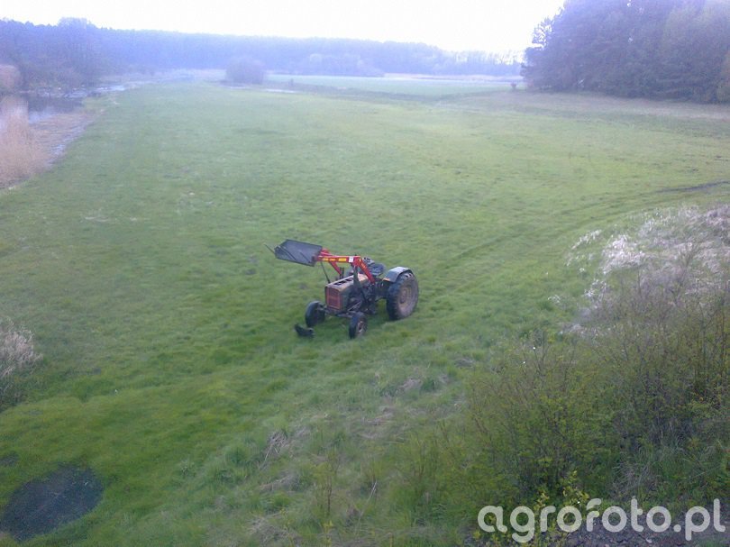 Ursus C-330 pracuje na łące z zamontowanym ładowaczem czołowym, wykorzystując kompaktowe rozmiary i prostą konstrukcję do typowych prac w gospodarstwie, takich jak zwożenie zielonki czy manipulacja belami. Ciągnik produkowano w latach 1967–1987, wyposażony jest w dwucylindrowy silnik wysokoprężny S-312C o pojemności 1960 cm³ i mocy około 30 KM, współpracujący z mechaniczną skrzynią biegów 6 2, co pozwala dobrać prędkość do lekkich i średnich prac polowych. Masa własna około 1900 kg zapewnia wystarczającą stabilność przy pracy z ładowaczem, a tylny TUZ o udźwigu około 1200 kg umożliwia agregowanie prostych maszyn łąkowych i transportowych. Na rynku wtórnym w Polsce przybliżone ceny Ursusa C-330 wahają się zazwyczaj w granicach 18–35 tys. zł w zależności od rocznika i stanu technicznego.