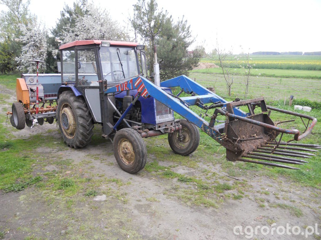 Ursus C-330 z lat produkcji 1967–1987, o mocy 30 KM z dwucylindrowym silnikiem S-312C o pojemności 1960 cm³, pracuje z zawieszanym siewnikiem zbożowym Poznaniak na polu przygotowanym do siewu. Mechaniczna skrzynia biegów 6/2 pozwala dobrać prędkość roboczą do równomiernego wysiewu, a masa własna ciągnika około 1900 kg zapewnia wystarczającą stabilność przy współpracy z maszyną zawieszaną. Tylny trzypunktowy układ zawieszenia o udźwigu około 800 kg bezproblemowo unosi kompletny zestaw siewny, a obecność ładowacza czołowego (tura) nie zakłóca pracy z maszyną uprawowo-siewną, zwiększając jednocześnie uniwersalność ciągnika w gospodarstwie. Na polskim rynku wtórnym przybliżone ceny Ursusa C-330 w dobrym stanie mieszczą się zazwyczaj w przedziale 18–30 tys. zł w zależności od wyposażenia i stopnia zużycia.