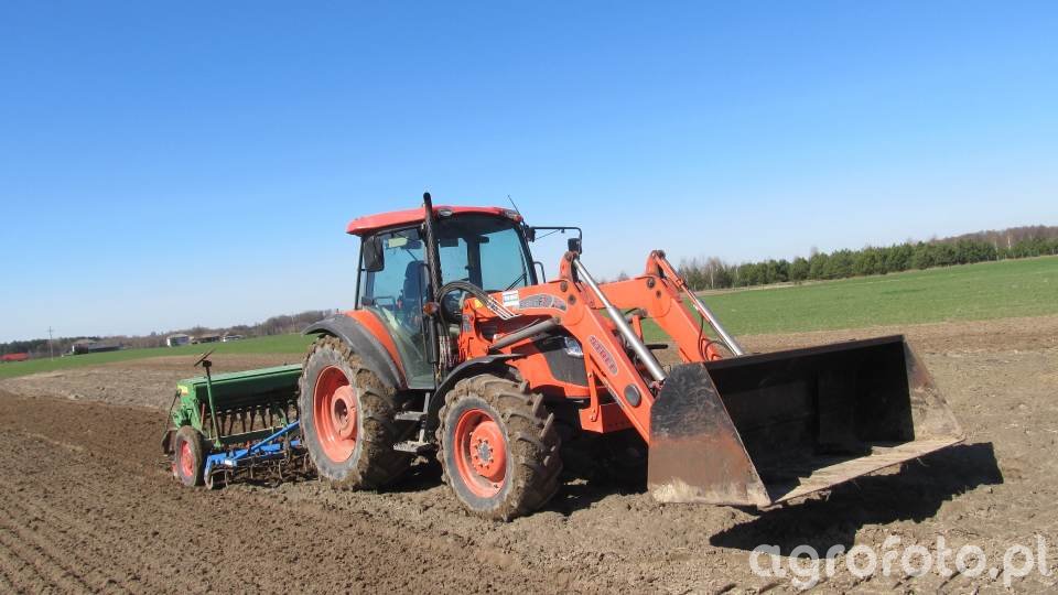 Na zdjęciu przedstawiony jest ciągnik rolniczy marki Kubota, model M9540. Ten ciągnik, wyposażony w silnik o mocy około 95 KM, pracuje w polu z agregatem uprawowo-siewnym Carré Vibrosem oraz siewnikiem Hassia DUX 100. Kubota M9540 jest napędzana 4-cylindrowym silnikiem, który zapewnia wystarczającą moc do współpracy z maszynami towarzyszącymi. Skrzynia biegów mechaniczna pozwala na precyzyjne dostosowanie prędkości jazdy do wykonywanej pracy. Ciągnik ten jest przystosowany do zadań uprawowych i siewnych, gdzie jego moc umożliwia efektywne zarządzanie narzędziami, zapewniając odpowiednią jakość pracy polowej. Współpraca z zestawem siewnym poszerza jego zastosowanie w sezonowych pracach rolniczych, wspierając wydajne przygotowanie gleby oraz siew nasion.