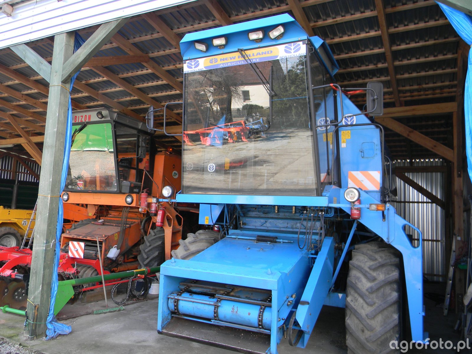 Kombajn New Holland, prawdopodobnie z serii TC, z widocznym logotypem marki, znajdujący się w pomieszczeniu gospodarczym, obok kombajnu Bizon. Maszyna ta, dzięki charakterystycznej niebieskiej kolorystyce, wpisuje się w profesjonalny segment sprzętu rolniczego marki New Holland. Kombajn wyposażony jest w heder, choć jego szczegółowy typ jest niewidoczny, co sugeruje uniwersalne zastosowanie w pracach żniwnych. Nowoczesne modele TC są zazwyczaj napędzane silnikiem Diesla o mocy około 175-300 KM, z systemem omłotu konwencjonalnego, co pozwala na wydajną eksploatację w różnych warunkach upraw. Pojemność zbiornika w tej serii często sięga 6500 litrów, co zapewnia długą, nieprzerwaną pracę na polu. Obok stojący Bizon, znany ze swojej pomarańczowej barwy, wskazuje na szeroki wybór sprzętu w gospodarstwie, umożliwiający dostosowanie do różnorodnych potrzeb w trakcie żniw.