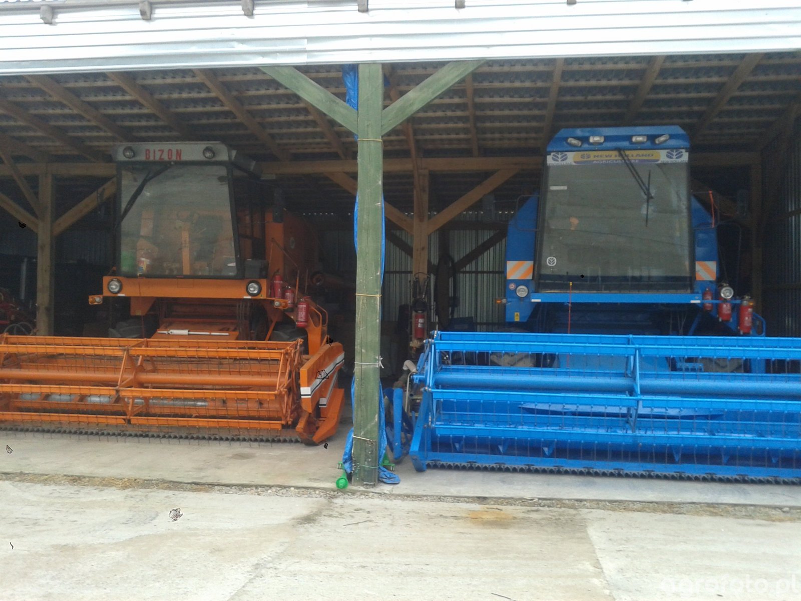 Kombajny Bizon Super Z056 i Bizon Rekord Z058 widoczne na zdjęciu, stoją w zadaszonej przestrzeni, gotowe do kolejnych prac polowych. Bizon Super Z056, wyróżniający się pomarańczową kolorystyką, jest wyposażony w heder z motowidłami pozwalający na efektywne koszenie zbóż. Napędzany silnikiem SW 400 o mocy 105 KM, posiada bęben młócący o szerokości 1250 mm, co pozwala na wydajny proces omłotu. Z kolei Bizon Rekord Z058, w charakterystycznym niebieskim kolorze, również posiada heder z motowidłami. Dzięki zastosowanemu silnikowi o mocy 120 KM i pojemności zbiornika na ziarno wynoszącej 3000 litrów, kombajn ten jest w stanie sprostać wyzwaniom dużych gospodarstw. Oba kombajny, charakterystyczne dla polskiego krajobrazu rolniczego, od wielu lat wspierają rolników w zbiorach, prezentując trwałość i funkcjonalność sprzętu marki Bizon.