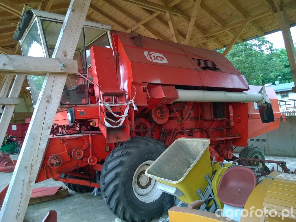 Kombajn Bizon Gigant podczas postoju w zadaszonej przestrzeni. Maszyna o charakterystycznej czerwonej kolorystyce marki Bizon, znanej z produkcji wytrzymałych i efektywnych kombajnów, jest stworzona z myślą o wydajnych pracach żniwnych. Model ten prawdopodobnie wyposażony jest w bębenowy system omłotu, który pozwala na efektywne przetwarzanie dużej ilości ziarna. Zbiornik ziarna o pojemności około 5 000 litrów umożliwia dłuższą pracę bez konieczności częstego opróżniania, a silnik Perkins o mocy około 120 KM napędza całą maszynę, zapewniając niezbędną moc do pracy w trudnych warunkach polowych. Kombajn ten jest symbolem trwałości i funkcjonalności, co czyni go doskonałym wyborem dla dużych gospodarstw rolnych.