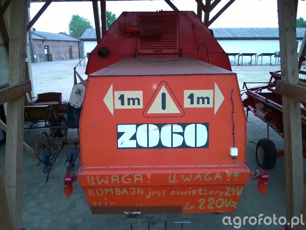Kombajn Bizon Z060 w trakcie prac konserwacyjnych pod zadaszeniem. Maszyna ta, znana z charakterystycznej czerwono-pomarańczowej kolorystyki, jest wyposażona w heder z motowidłami do koszenia zbóż. Bizon Z060 z napędem na tylne koła jest często wykorzystywany w średniej wielkości gospodarstwach rolnych. Maszyna ma silnik o mocy około 105 KM oraz zbiornik o pojemności 3000 litrów, co pozwala na efektywne wykorzystanie podczas żniw. Prezentowany model znajduje się na wyłożonym kostką placu, co sugeruje, że jest w czasie postoju lub przeglądu, a jego konstrukcja świadczy o solidnej budowie, typowej dla polskich kombajnów z tej serii.