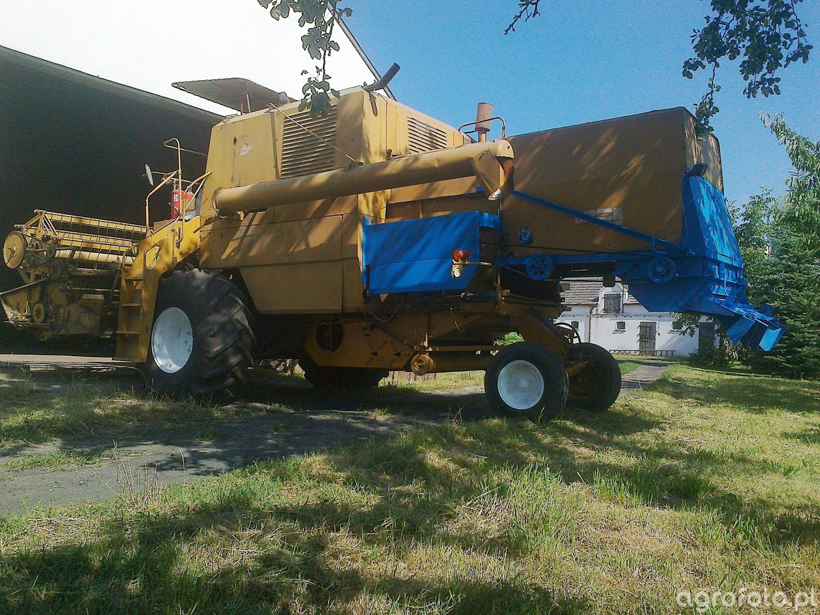 Kombajn Bizon Z056 widoczny na zdjęciu to charakterystyczna maszyna, używana przede wszystkim do żniw zbóż. Wyposażony w klasyczny heder z motowidłami, jest idealny do koszenia pszenicy, żyta czy jęczmienia. Model ten wyróżnia się żółto-niebieską kolorystyką, która jest charakterystyczna dla tej serii. Bizon Z056 napędzany jest czterocylindrowym silnikiem S-4002 o mocy około 105 KM, co pozwala na efektywną pracę w polu. Posiada system młocarni bębnowej, co umożliwia skuteczne oddzielanie ziarna od słomy, a jego zbiornik ziarna ma pojemność około 2 500 litrów. Maszyna prezentowana jest w otoczeniu gospodarstwa, w pobliżu zabudowań gospodarczych, co sugeruje stan gotowości do prac polowych. Obecność w cieniu drzew i blisko budynków może wskazywać na przygotowanie do nadchodzącego sezonu żniwnego lub krótki postój po pracy.