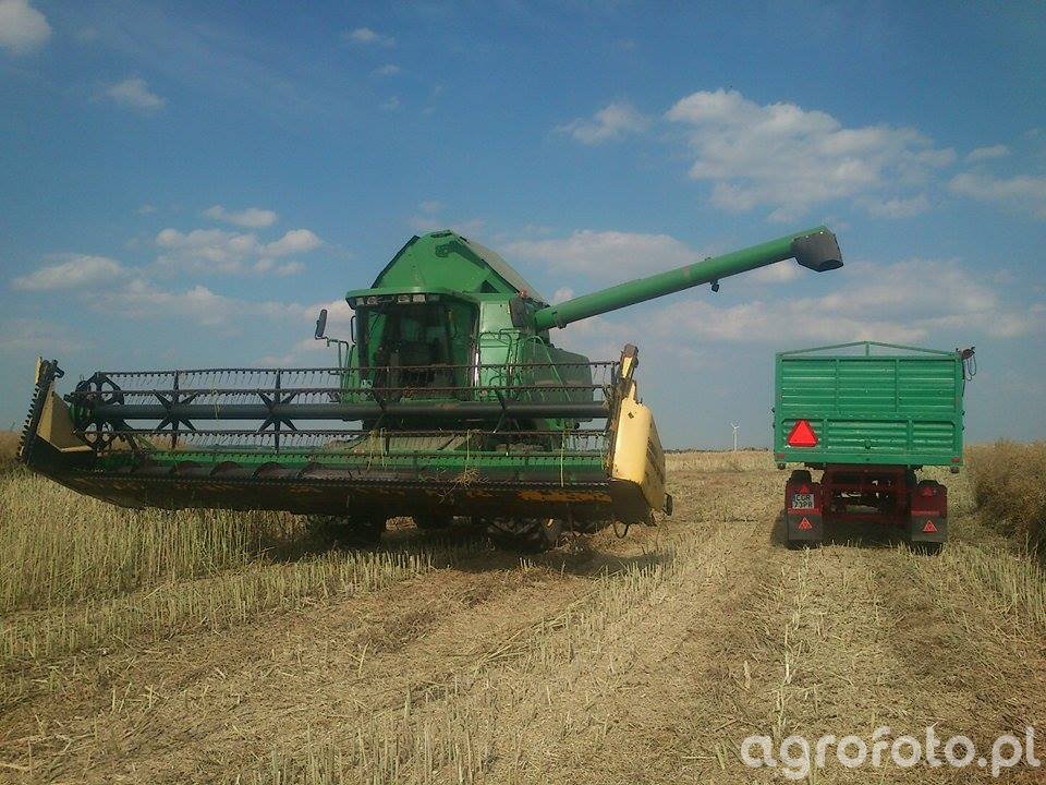Kombajn John Deere 9780 CTS podczas prac żniwnych na polu zboża. Maszyna wyposażona jest w silnik PowerTech o mocy 360 KM, co zapewnia odpowiednią siłę napędową dla systemu omłotowego CTS z dwoma rotorami, zwiększając wydajność i jakość zbioru. Zbiornik ziarna o pojemności 10 500 litrów umożliwia długą pracę bez konieczności częstego rozładunku. Widoczny na zdjęciu heder z motowidłami dedykowany jest do koszenia zbóż, co w połączeniu z precyzyjnym układem cięcia, zapewnia efektywne żniwa. Kombajn pracuje na ściernisku, a w tle widoczna jest przyczepa gotowa na odbiór ziarna, co podkreśla dynamiczny charakter pracy polowej.