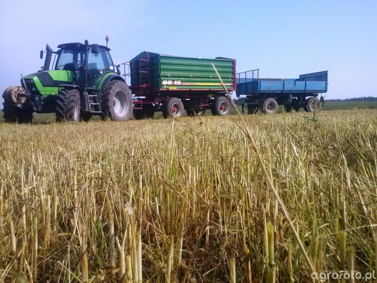Ciągnik rolniczy Deutz-Fahr 6160 pracuje na ściernisku, transportując zielonkę na przyczepie rolniczej. Maszyna napędzana jest silnikiem Deutz o mocy 160 KM, co zapewnia wydajność i efektywność w ciężkich warunkach polowych. Wyposażony w mechaniczno-hydrauliczne wspomaganie skrętu oraz skrzynię biegów typu 24/24, model 6160 doskonale radzi sobie z manewrowaniem podczas załadunku i transportu. Pojemność skokowa silnika wynosząca 6,1 litra w połączeniu z sześcioma cylindrami gwarantuje płynne działanie i niezawodną pracę. Dodatkowo, tylny trzypunktowy układ zawieszenia umożliwia pewne połączenie z różnymi maszynami towarzyszącymi, co czyni ten ciągnik wszechstronnym narzędziem w gospodarstwie, zdolnym do współpracy z rozmaitymi urządzeniami, takimi jak przyczepy czy siewniki.