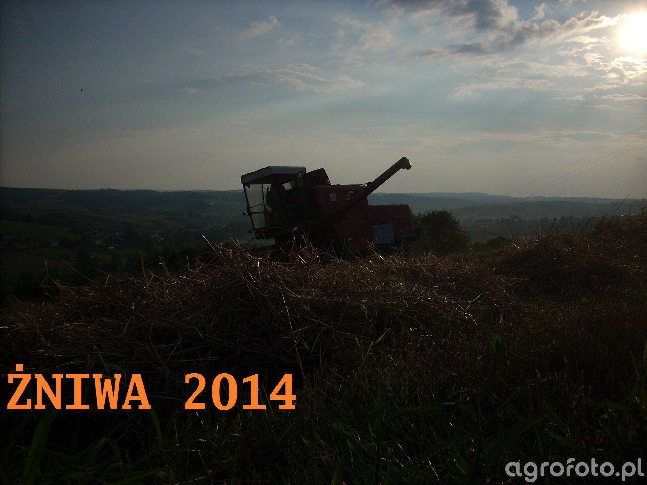 Kombajn Bizon Z056 podczas żniw na polu zboża. Maszyna, charakterystyczna dzięki swojej czerwonej konstrukcji, została zaprojektowana do efektywnego zbioru zbóż przy użyciu hedera z motowidłami. Napędzany silnikiem S-4002 o mocy 100 KM, Bizon Z056 posiada bębnowy system omłotu, który zapewnia wysoką wydajność przy utrzymaniu jakości zebranego ziarna. Oferuje zbiornik o pojemności 3 000 litrów, co umożliwia dłuższe cykle robocze bez częstych przestojów na opróżnianie. Kombajn doskonale radzi sobie w polskich warunkach, gdzie koszenie odbywa się na zróżnicowanym terenie, co widoczne jest na załączonym zdjęciu z panoramą pól.