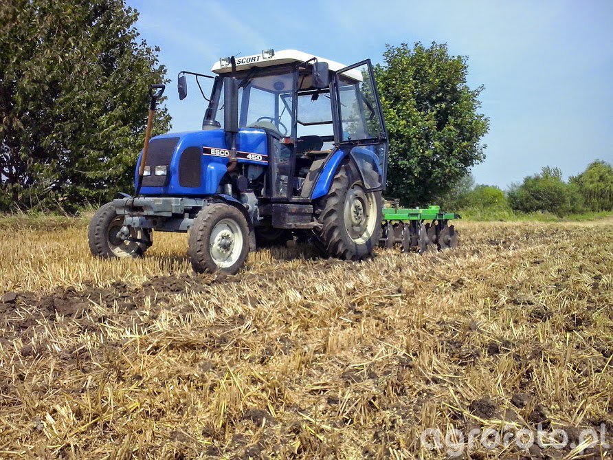 Ciągnik Eskort 450 w trakcie talerzowania na ściernisku współpracuje z broną talerzową Bomet 2,0. Wyposażony w silnik trzycylindrowy o pojemności 2,7 litra, ciągnik generuje moc 45 KM. Mechaniczna skrzynia biegów o przełożeniach 8/2 zapewnia doskonałą kontrolę podczas pracy na polu. Brona talerzowa skutecznie rozdrabnia pozostałości po żniwach, co w połączeniu z mocą ciągnika pozwala na efektywne przygotowanie gleby pod przyszłe uprawy.