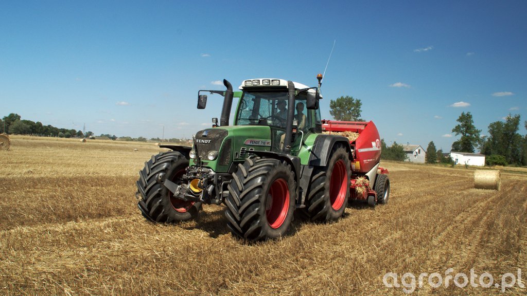 Ciągnik Fendt 718 Vario TMS operuje na ściernisku, współpracując z prasą zwijającą do prasowania słomy. Moc znamionowa tego modelu wynosi około 180 KM, co umożliwia sprawną obsługę maszyny towarzyszącej. Napęd zapewnia wydajny, 6-cylindrowy silnik o pojemności 6,06 litra. Skrzynia typu Vario umożliwia płynne dostosowywanie prędkości bez stopniowego przełączania biegów, co jest idealne do precyzyjnych manewrów na polach o nierównej powierzchni. Wysoka moc oraz zaawansowana technologia skrzyni biegów pozwalają na efektywne prasowanie nawet w trudnych warunkach terenowych, zwiększając ogólną wydajność operacji polowych.
