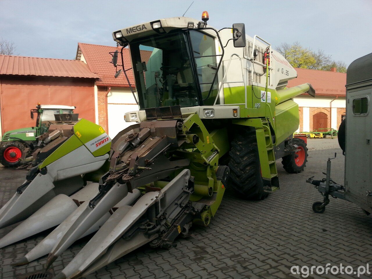 Kombajn Claas Mega 350 z hederem marki Geringhoff CornStar 6-75 SW 177 podczas przygotowania do zbioru kukurydzy na placu gospodarstwa. Widoczny na zdjęciu zespół koszący z dziobami jest przystosowany do wydajnej pracy w uprawach kukurydzy, pozwalając na efektywne oddzielanie kolb od łodyg. Kombajn Claas Mega 350 wykorzystuje system omłotu APS, który zwiększa wydajność poprzez wstępne przyspieszenie materiału żniwnego. Maszyna jest wyposażona w silnik Perkins 1006-60T o mocy 204 KM, co zapewnia wystarczającą moc do pracy w różnorodnych warunkach polowych. Pojemność zbiornika na ziarno wynosząca 8500 litrów umożliwia długotrwałą pracę bez konieczności częstego wyładowywania plonu. Konstruktorska precyzja i charakterystyczna zielono-biała kolorystyka podkreślają nowoczesność i solidność konstrukcji Claas.