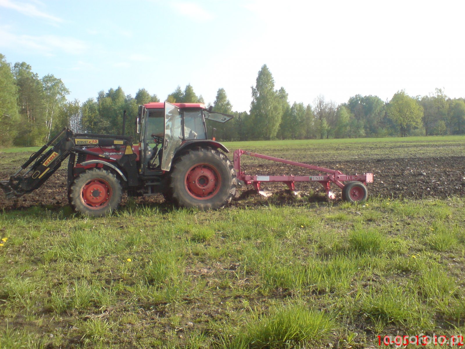 Kubota ME9000 to wszechstronny ciągnik rolniczy, idealny do różnorodnych prac polowych. Wyposażony w silnik o mocy 95 KM, zapewnia wystarczającą moc do efektywnej współpracy z szerokim zakresem maszyn, takich jak pług Unia TUR 4 , widoczny na zdjęciu. Silnik czterocylindrowy o pojemności 3,8 litra gwarantuje optymalne osiągi i niezawodność w trudnych warunkach terenowych. Ciągnik posiada mechaniczny układ sterowania skrzynią biegów, co umożliwia precyzyjną kontrolę nad prędkością jazdy, istotną podczas orki. Kubota ME9000 doskonale sprawdza się w pracy z pługiem, dzięki czemu zapewnia dokładne i równomierne spulchnianie gleby, przygotowując ją do dalszych etapów uprawy. Dodatkowo, dzięki solidnej konstrukcji i odpowiedniemu rozkładowi masy, jest w stanie skutecznie operować nawet na wymagających polach.