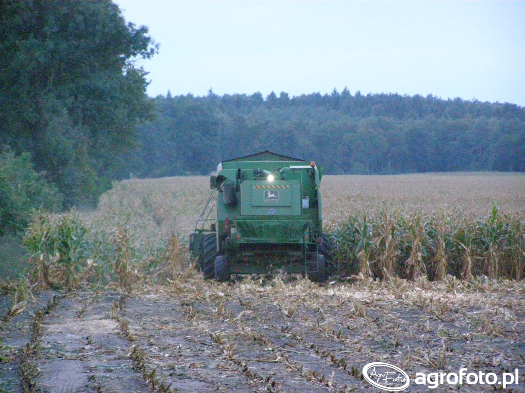 Kombajn John Deere 2264 podczas zbioru kukurydzy na polu. Widoczna na zdjęciu maszyna jest wyposażona w typowy dla tego rodzaju pracy heder z dzióbmi, co wskazuje na specjalizację w zbiorze kukurydzy. Kombajn napędzany jest potężnym silnikiem o mocy 260 KM, co pozwala na efektywną pracę w różnorodnych warunkach terenowych. Posiada zbiornik o pojemności 9 000 litrów, co umożliwia długie okresy pracy bez konieczności przerywania na rozładunek ziarna. Maszyna charakteryzuje się konwencjonalnym systemem omłotu, dostosowanym do wysokiej wydajności i zminimalizowanej utraty ziarna. Kombajn działa w otwartym terenie, otoczonym lasem, co tworzy obraz typowy dla intensywnych prac rolniczych na dużych obszarach. Dzięki niej rolnicy mogą efektywnie przeprowadzać zbiór, maksymalizując plony.