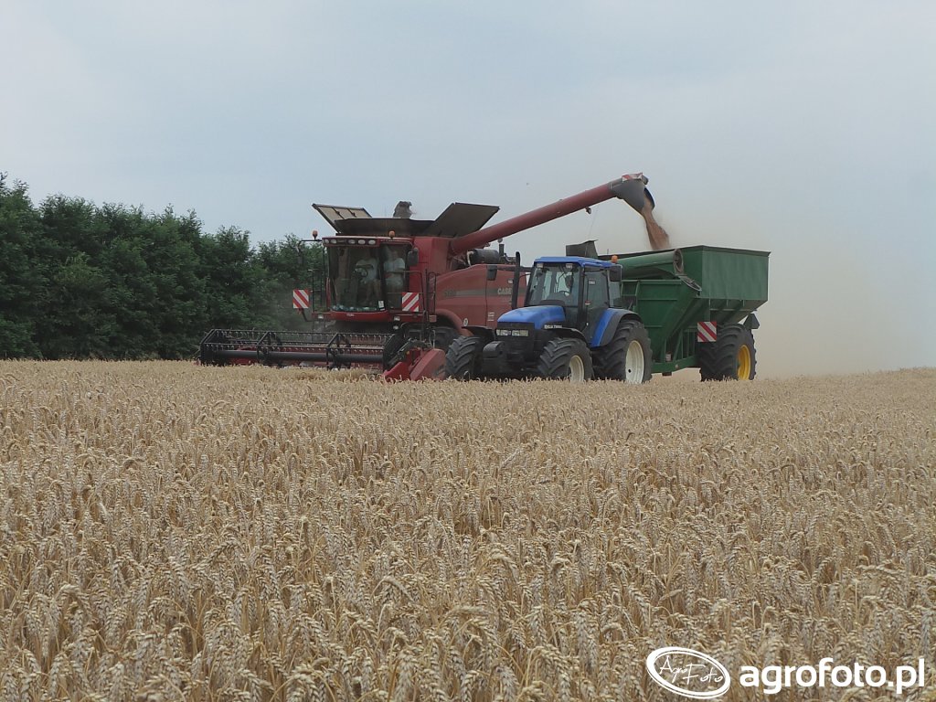 Kombajn Case IH Axial-Flow 7140 pracuje na polu podczas zbioru zboża, wykorzystując rotorowy system omłotu, który zapewnia wysoką przepustowość. Maszyna napędzana jest silnikiem o mocy około 449 KM, co umożliwia efektywną pracę nawet w trudnych warunkach polowych. Zbiornik na ziarno o pojemności 10 570 litrów pozwala na długie przejazdy robocze bez konieczności częstego rozładunku. Kombajn działa z przystawką do zboża, co umożliwia precyzyjne koszenie pola o dużej powierzchni, przyczyniając się do maksymalizacji wydajności procesu zbioru.