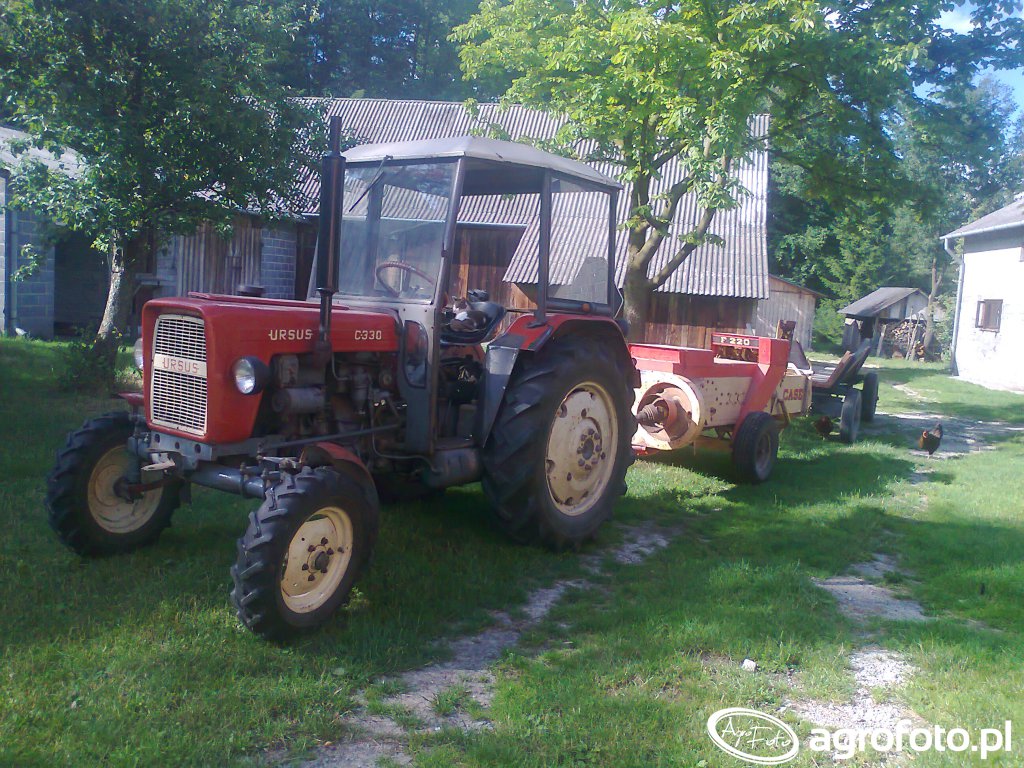 Ursus C-330 współpracuje z prasą kostkującą Case F220 podczas typowych prac w gospodarstwie, wykorzystując swoją prostą, ale solidną konstrukcję do napędu WOM i obsługi lekkich maszyn zielonkowych. Ciągnik był produkowany w latach 1967–1987, wyposażony w dwucylindrowy silnik wysokoprężny S-312C o pojemności 1960 cm³ i mocy około 30 KM, co w zupełności wystarcza do pracy z prasą małogabarytową. Mechaniczna skrzynia biegów 6 2 umożliwia dobór odpowiedniej prędkości roboczej przy prasowaniu słomy lub siana, a masa własna około 1900 kg zapewnia wystarczającą stabilność na utwardzonym placu gospodarstwa. Tylni podnośnik TUZ o udźwigu w granicach 1200 kg pozwala na agregowanie osprzętu towarzyszącego, a kompaktowe wymiary Ursusa C-330 sprawiają, że ciągnik sprawdza się w ciasnych podwórzach i niewielkich zabudowaniach. Przybliżone ceny używanych egzemplarzy na rynku polskim mieszczą się zazwyczaj w przedziale 15 000–30 000 zł, w zależności od stanu technicznego i wyposażenia.