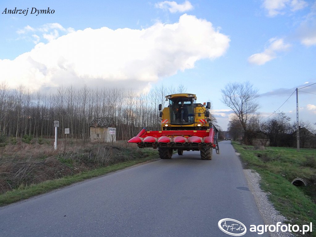 Kombajn New Holland TC5050 widziany podczas transportu na drodze dojazdowej, przygotowuje się do prac żniwnych. Charakterystyczną cechą tej maszyny jest ośmiorzędowy heder do zbioru kukurydzy. TC5050 napędzany jest czterocylindrowym silnikiem NEF o mocy około 175 KM, co zapewnia wydajność podczas różnorodnych prac polowych. System omłotu oparty na konwencjonalnym bębnie pozwala na efektywne oddzielanie ziarna od roślin. Pojemność zbiornika na ziarno wynosi 5200 litrów, co umożliwia dłuższe cykle pracy bez częstego rozładunku. Kombajn utrzymany w klasycznych barwach New Holland - żółtej i niebieskiej - harmonijnie wpasowuje się w wiejski krajobraz, gotowy do wyzwań podczas kolejnych sezonów żniwnych.