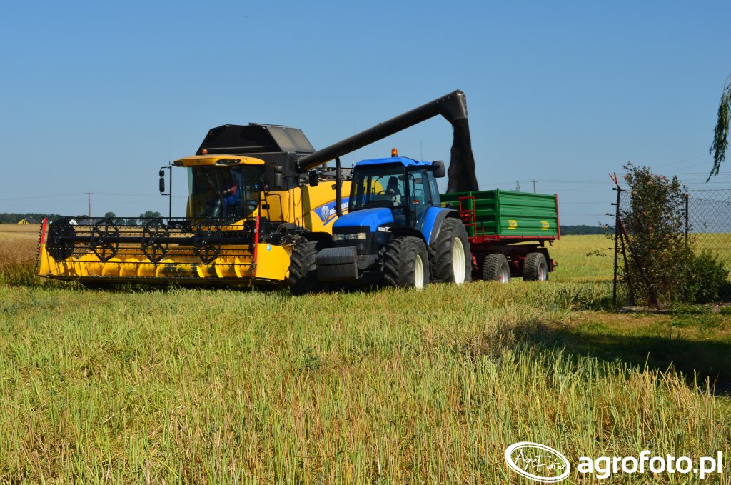 Kombajn New Holland CX 6090 podczas pracy na polu zboża. Widoczna na zdjęciu maszyna wykorzystuje heder z motowidłami, co wskazuje na proces koszenia zbóż. CX 6090 jest wyposażony w silnik o mocy około 300 KM, zapewniający efektywność podczas żniw. System omawiania to konwencjonalny bęben młócący, który ma za zadanie optymalizować wydajność zbiorów. Kombajn wspomagany jest przez traktor New Holland TM165 z przyczepą, do której trafia zboże poprzez rurę wysypową, co pozwala na ciągłość pracy bez konieczności częstego przerywania. Zbiornik ziarna o pojemności około 9 300 litrów wspomaga dłuższe operacje na polu, minimalizując konieczność częstego rozładunku. Otoczenie to rozległy teren uprawny, gdzie maszyna sprawnie porusza się po ściernisku, przygotowując grunt pod kolejne etapy obróbki.