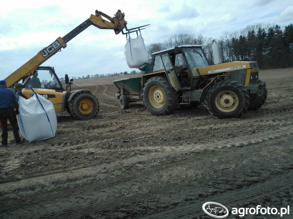 Załadunek ładowarką JCB na rozsiewacz