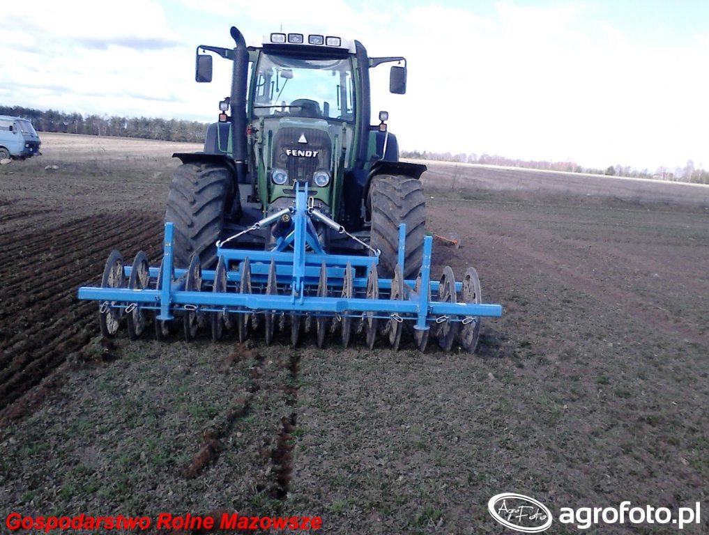 Ciągnik Fendt 712 z serii Vario 700 pracuje na polu, przygotowując glebę do siewu. Posiada moc znamionową 130 KM, co zapewnia efektywną współpracę z ciężkimi maszynami, jak brona talerzowa, z którą jest obecnie zintegrowany. Silnik Deutz z sześcioma cylindrami i pojemnością skokową 6.1 litra gwarantuje niezawodność i sprawność w wymagających warunkach polowych. Mechaniczna skrzynia biegów z funkcją Vario oferuje precyzyjne sterowanie, co poprawia wydajność operacyjną. Dzięki temu Fendt 712 może skutecznie przygotować pole do siewu, nawet na większych obszarach, co czyni go idealnym rozwiązaniem do intensywnych zadań rolniczych.