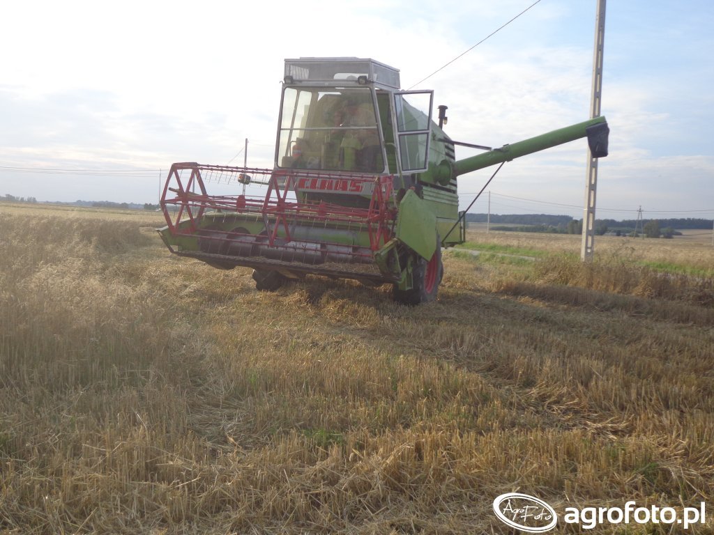 Kombajn Claas Mercator w trakcie żniw na polu zbożowym. Charakterystyczna zielono-czerwona kolorystyka i oznakowanie na kabinie jednoznacznie identyfikują go jako model z dobrze znanej serii Mercator. Maszyna widoczna na zdjęciu jest wyposażona w heder z motowidłami, co wskazuje na pracę przy koszeniu zbóż. Kombajn pracuje na ściernisku, co sugeruje zakończony proces zbioru. Claas Mercator to kompaktowy model, który w swoich wersjach posiadał silniki o mocy od 80 do 105 KM, zapewniające dobrą wydajność przy mniejszych rozmiarach. Zbiornik ziarna o pojemności około 3000 litrów pozwala na dłuższe przebiegi pracy bez konieczności częstego rozładunku. Klasyczny układ omłotu z bębnem młócącym gwarantuje skuteczne oddzielanie ziarna od kłosów w różnorodnych warunkach polowych. Kombajn ten stanowi nieodzowną część gospodarstw rolnych, oferując niezawodność i efektywność przy pracy na średnich arealach.
