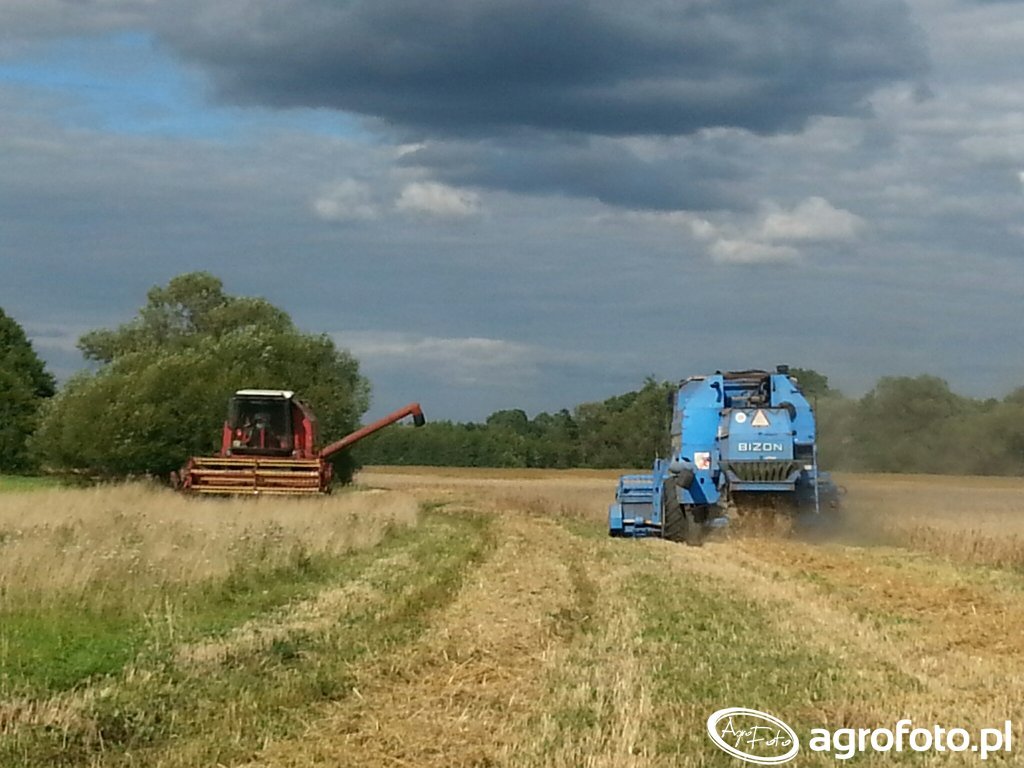 Kombajn Bizon podczas prac żniwnych na polu zboża. Na zdjęciu widoczny jest klasyczny model Bizon Rekord Z058, charakterystyczny dzięki niebieskiej kolorystyce i prostokątnemu kształtowi kabiny. Maszyna wyposażona jest w heder z motowidłami, służący do koszenia zbóż, co wskazuje na typowy proces żniw. Kombajn napędza silnik o mocy około 150 KM, a system omłotu oparty jest na klasycznym bębnie młócącym. Pojemność zbiornika ziarna wynosi 3 500 litrów, co umożliwia efektywne zbieranie plonów na dużych obszarach. Na zdjęciu kombajn operuje na ściernisku, podkreślając jego zdolność do pracy w zróżnicowanych warunkach polowych, co jest typowe dla tej znanej serii maszyn produkowanych w Polsce.