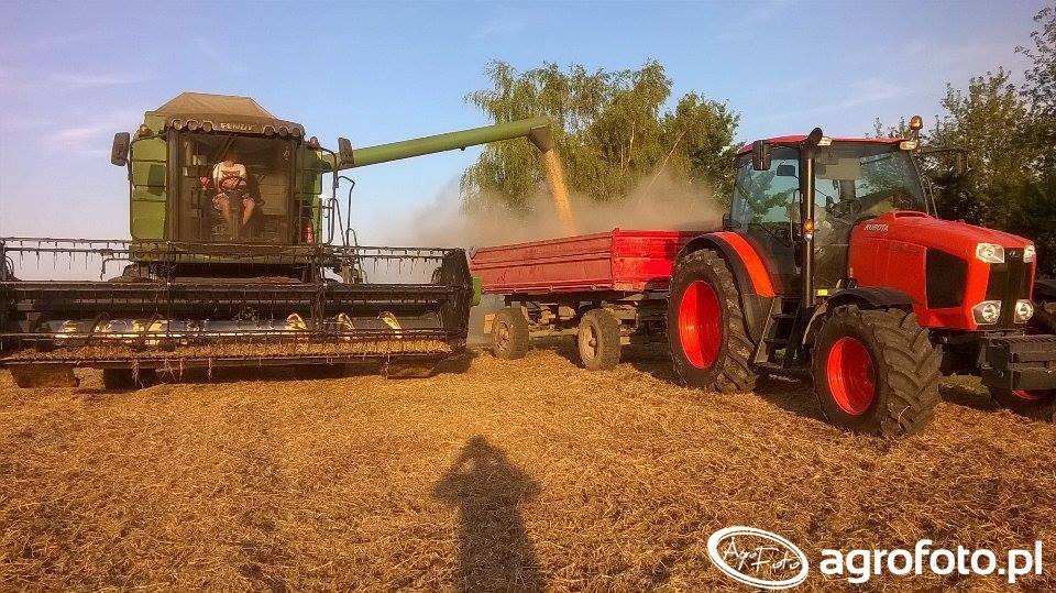 Kombajn Fendt 5220 E w trakcie prac żniwnych przedstawiony jest podczas rozładunku ziarna na przyczepę ciągniętą przez ciągnik rolniczy. Maszyna, wyposażona w heder z motowidłami, odpowiednia jest do koszenia zbóż na polu. Kombajn Fendt 5220 E, dzięki silnikowi o mocy 218 KM i pojemności zbiornika 6500 litrów, oferuje efektywną pracę, zapewniając płynny i szybki proces żniw. Widoczny na zdjęciu transport zboża do przyczepy wskazuje na zakończenie cyklu zbiorów, a dobrze przygotowane ściernisko potwierdza precyzyjną pracę hedera. Działania te odbywają się w optymalnych warunkach pogodowych, co dodatkowo zwiększa wydajność operacji.