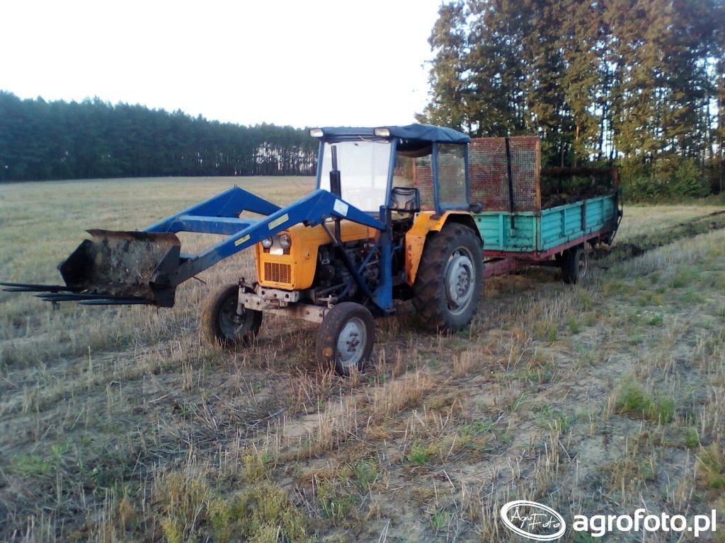 Ursus C-330N z serii lekkich ciągników C-325 – C-335 pracuje na ściernisku z przyczepą rolniczą, realizując transport obornika z wykorzystaniem ładowacza czołowego. Maszyna napędzana jest dwucylindrowym silnikiem wysokoprężnym S312C o pojemności 1960 cm³ i mocy około 30 KM, współpracującym z mechaniczną skrzynią biegów 6/2, co zapewnia wystarczający zakres prędkości do lekkich prac polowych i transportowych. Masa własna Ursusa C-330N wynosi około 1900 kg, a udźwig tylnego TUZ sięga w przybliżeniu 800–900 kg, dzięki czemu ciągnik dobrze radzi sobie z obsługą maszyn zawieszanych i niewielkich przyczep. Model ten produkowany był w przybliżeniu w latach 70. i 80. XX wieku, a obecnie na rynku wtórnym w Polsce używane egzemplarze Ursusa C-330N osiągają przybliżone ceny w granicach 20 000–35 000 zł w zależności od stanu technicznego i wyposażenia.