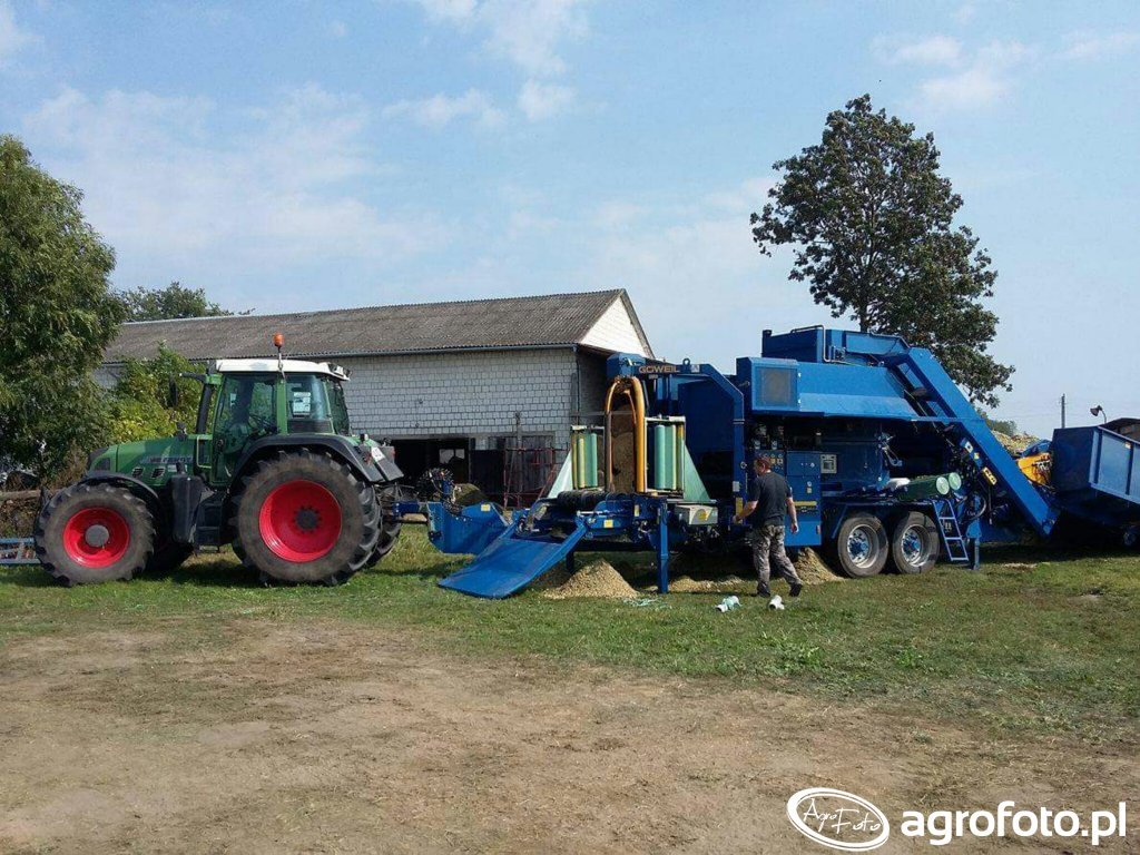 Ciągnik Fendt 818 pracuje na placu gospodarstwa, współpracując z owijarką bel marki Goweil. Posiada moc znamionową wynoszącą 180 KM, co pozwala na wydajne wykonywanie zadań w gospodarstwie rolnym. Wyposażony w silnik Deutz z sześcioma cylindrami i pojemnością 6.1 litra, zapewnia nie tylko dużą moc, ale także stabilne działanie nawet w trudnych warunkach. Zaawansowana skrzynia biegów Vario umożliwia płynną zmianę przełożeń, co jest kluczowe podczas wykonywania precyzyjnych manewrów w ciasnych przestrzeniach. Moc ciągnika i zaawansowana technologia wspomagają prace z owijarką, poprawiając efektywność i komfort pracy na co dzień.