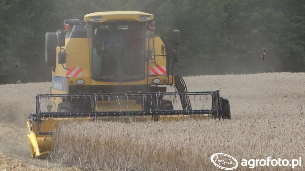 Kombajn New Holland TC5050 podczas koszenia zbóż na polu. Maszyna wyposażona jest w heder z motowidłami, co pozwala na efektywne zbiory różnorodnych upraw zbożowych. Model TC5050 napędzany jest silnikiem o mocy około 175 KM, zapewniającym odpowiednią wydajność podczas żniw. Zbiornik ziarna o pojemności 5200 litrów umożliwia dłuższą pracę bez konieczności częstego opróżniania. Kombajn wyróżnia się także zastosowaniem konwencjonalnego bębna omłotowego, który skutecznie dostosowuje się do różnych warunków zbiorów. Charakterystyczna żółta kolorystyka podkreśla przynależność do serii New Holland, co czyni go rozpoznawalnym na polu.
