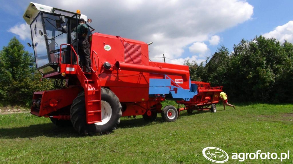 Kombajn Bizon Z056 Super prezentowany na zdjęciu to klasyczny model polskiej produkcji, który od lat dumnie pracuje na polach zbóż. Konstrukcja charakteryzuje się intensywnie czerwoną kolorystyką oraz charakterystycznym hederem z motowidłami, idealnym do koszenia zboża. Maszyna wyposażona jest w silnik o mocy 120 KM, co pozwala na efektywne zasilanie systemu omłotu. Zbiornik na ziarno o pojemności 3000 litrów umożliwia dłuższe etapy pracy bez konieczności częstego opróżniania. Kombajn widoczny na zdjęciu znajduje się w trakcie postoju na tle zielonego pola, co podkreśla jego gotowość do rozpoczęcia lub kontynuacji prac żniwnych w dogodnych warunkach. Bizon Z056 Super to symbol trwałości i funkcjonalności, idealnie wpisujący się w potrzeby rolników podczas sezonu żniwniczego.