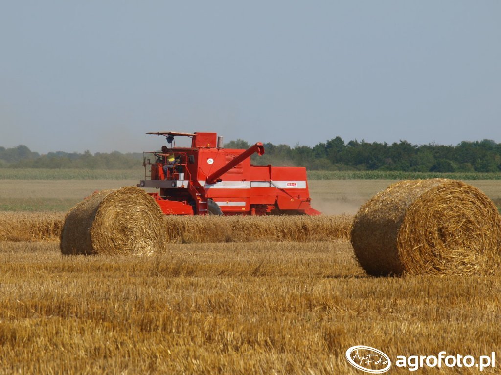 Kombajn Bizon Super Z056 podczas prac żniwnych na ściernisku. Ta polska maszyna wyróżnia się charakterystycznym czerwonym kolorem i prostokątnym kształtem kabiny operatora. Bizon Super Z056 jest wyposażony w klasyczny heder z motowidłami, przeznaczony do koszenia zbóż. Napędzany jest czterocylindrowym silnikiem S-4002 o mocy 100 KM, który zapewnia wystarczającą moc do skutecznego omłotu w polowych warunkach. Zbiornik na ziarno o pojemności 3 000 litrów pozwala na dłuższą pracę bez konieczności częstego opróżniania, co jest istotne podczas intensywnych okresów żniw. Maszyna pracuje na polu, gdzie widać już przygotowane bale słomy, co wskazuje na zaawansowany etap zbiorów.