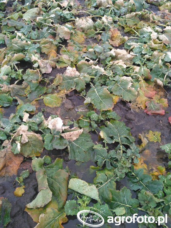 Tak wygląda rzepak po tego rocznej zimie. Przykryty był ok. 20 cm warstwą śniegu w czasie panowania największych mrozów. Tak jak widać na zdjęciu spora część znajduje pod częściowo pod wodą. Do tej pory śnieg topił się powoli, ale dziś w nocy było w okolicach +1 i padał deszcz, więc wszystko szybko się stopiło i taki teraz efekt mamy. Miałem powoli ruszać z sianiem nawozów, ale teraz chyba się wstrzymam, bo boję się, że spora część nawozu może po prostu spłynąć z wodą.