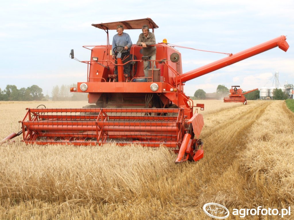 Kombajn Bizon Super Z056 podczas żniw pszenżyta na polu. Maszyna ta jest wyposażona w silnik S-4002 o mocy ok. 100 KM, co pozwala na efektywne zarządzanie pracą systemu omłotu bębnowego. Kombajn posiada zbiornik ziarna o pojemności 2 500 litrów, co umożliwia dłuższe okresy pracy bez przestojów na opróżnianie. Na zdjęciu widoczny jest heder z motowidłami, który jest używany do koszenia zbóż. Bizon Super Z056, wyróżniający się charakterystyczną czerwoną konstrukcją, idealnie sprawdza się na średnich i większych gospodarstwach, gdzie efektywność i niezawodność mają kluczowe znaczenie.