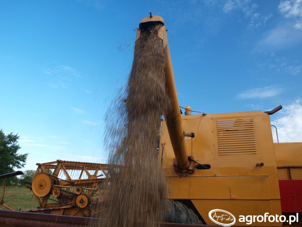 Kombajn Bizon Super Z056 podczas wyładunku ziarna zboża na polu. Maszyna ta, znana ze swojej klasycznej konstrukcji, jest wyposażona w silnik o mocy 100 KM, który zapewnia wystarczającą siłę napędową do efektywnej pracy w terenie. Bizon Super Z056 posiada zbiornik o pojemności 3 000 litrów, co pozwala na dłuższą pracę bez konieczności częstego przerywania na wyładunek. System omłotu bębnowy skutecznie oddziela ziarno od słomy. Charakterystyczny, żółty heder z motowidłami umożliwia precyzyjne koszenie zbóż różnego rodzaju. Kombajn pracuje na ściernisku, co podkreśla jego wszechstronność i dostosowanie do pracy w różnych warunkach polowych.