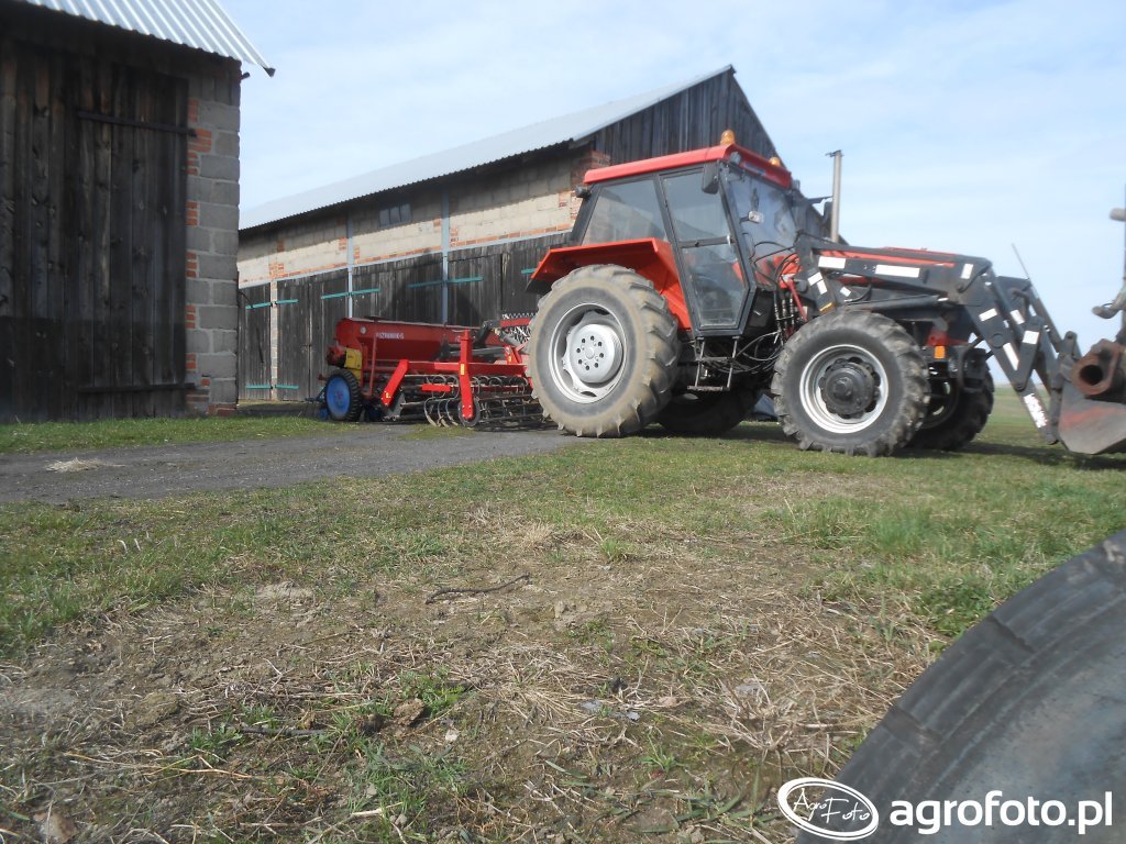 Ursus 1014 z napędem 4x4 pracuje z zawieszonym siewnikiem poznaniak, przygotowując się do typowych prac polowych w średnim gospodarstwie. Ciągnik należy do serii ciężkiej Ursusa, produkowanej w latach 1984–2009, i jest wyposażony w czterocylindrowy silnik Andoria 4C90 o pojemności 4,2 l, rozwijający około 100 KM, co zapewnia wystarczający zapas mocy do współpracy z ładowaczem czołowym i maszynami uprawowo-siewnymi. Mechaniczna skrzynia biegów oferuje 16 biegów do przodu i 8 wstecz (z półbiegami), umożliwiając dobór prędkości roboczej zarówno do transportu, jak i siewu. Masa własna ciągnika sięga około 4,2 t, a udźwig tylnego TUZ wynosi w przybliżeniu 4,2–4,5 t, co pozwala stabilnie przenosić klasyczny siewnik z pełnym zasypem ziarna. Na rynku wtórnym w Polsce używany Ursus 1014 osiąga przybliżone ceny w zakresie 60–90 tys. zł, zależnie od stanu technicznego, rocznika i wyposażenia dodatkowego, w tym ładowacza.