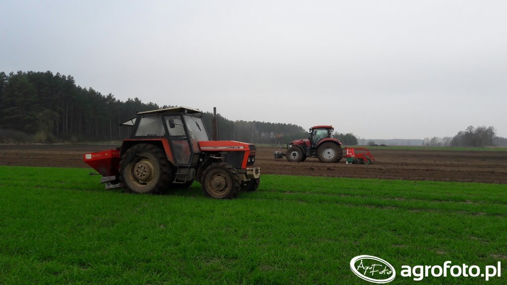 Ursus 1014 podczas pracy polowej z rozsiewaczem nawozów wykonuje nawożenie przedsiewne na polu uprawnym, wykorzystując pełnię możliwości silnika o mocy około 100 KM. Ciągnik wyposażony jest w 4‑cylindrowy silnik wysokoprężny Zetor o pojemności 4,6 l, znany z dobrej elastyczności i niskiego zużycia paliwa przy pracy z maszynami zawieszanymi. Mechaniczna skrzynia biegów z reduktorem oferuje 16/8 przełożeń, co pozwala dobrać optymalną prędkość roboczą do wysiewu nawozów mineralnych i ewentualnego współpracującego siewnika. Tylny trzypunktowy układ zawieszenia o udźwigu około 3,5 t zapewnia stabilne prowadzenie rozsiewacza nawet przy pełnym zasypie. Masa własna Ursusa 1014 wynosi około 4,2 t, co poprawia trakcję w polu. Model produkowano w latach 1984–1993, a przybliżone ceny rynkowe używanych egzemplarzy w Polsce mieszczą się zazwyczaj w przedziale 45–80 tys. zł, zależnie od stanu technicznego i wyposażenia.