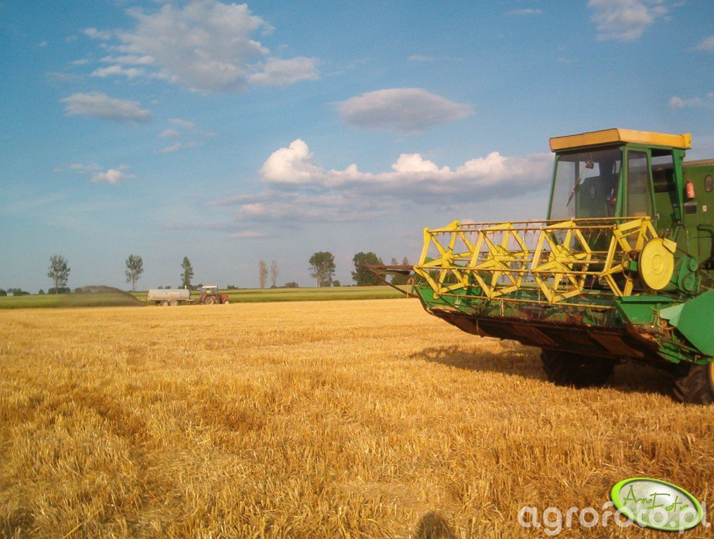 Kombajn John Deere, prawdopodobnie model JD 975, pracuje podczas żniw na polu zbożowym. Maszyna jest wyposażona w heder z motowidłami, co jest typowe dla operacji związanej z koszeniem zbóż. JD 975 jest napędzany sześciocylindrowym silnikiem Diesla o mocy około 170 KM, co zapewnia odpowiednią wydajność podczas pracy w polu. System omłotu wykorzystuje bębnową technologię omłotową, która jest skuteczna w przetwarzaniu zboża bez nadmiernego uszkadzania ziaren. Pojemność zbiornika na ziarno wynosi około 6 500 litrów, co pozwala na dłuższe okresy pracy bez potrzeby częstego wyładunku. Kombajn dzięki swojej zielono-żółtej kolorystyce jest charakterystyczny dla marki John Deere, a jego masywna konstrukcja podkreśla solidność i niezawodność w trudnych warunkach żniwnych. Szerokie pole i wyraźnie zaznaczone ściernisko wskazują na intensywną pracę nad zbiorami w sprzyjających warunkach pogodowych.