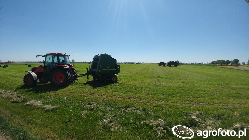 Ciągnik Kubota M5, pracujący mózellerszą prasa zwijającą John Deere, efektywnie wykonuje pracę na łące podczas prasowania sianokiszonki. Kubota M5, z mocą znamionową około 92 KM i czterocylindrowym silnikiem marki Kubota o pojemności 3.8 L, z łatwością radzi sobie w terenie, zapewniając odpowiednie siły do wsparcia pracy z ciężką prasą. Mechaniczna skrzynia biegów 12/12 umożliwia precyzyjne dopasowanie prędkości do specyficznych wymagań pracy polowej, co jest kluczowe podczas wymagających zadań, takich jak prasowanie. Solidna konstrukcja ciągnika zapewnia stabilność i niezawodność w każdych warunkach, podczas gdy John Deere współpracuje przy załadunku prasowanej sianokiszonki, maksymalizując wydajność operacyjną na polu.