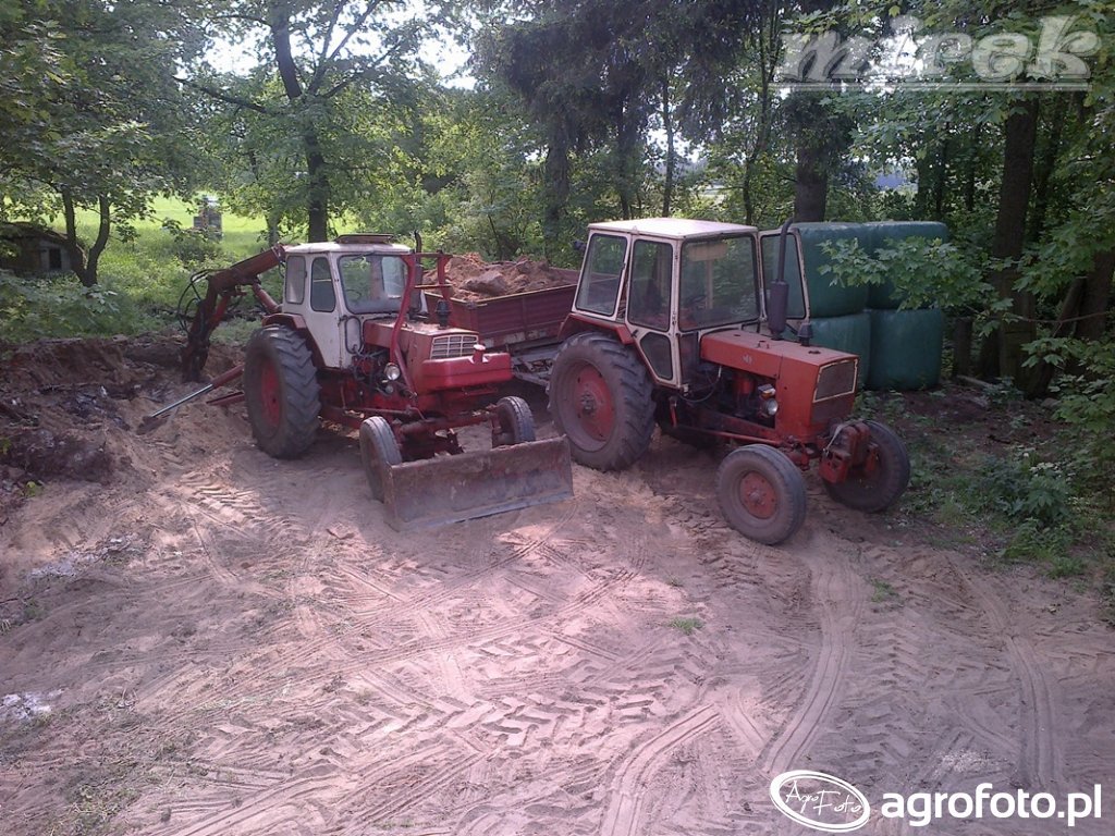 Ciągnik Jumz, znany ze swojej wszechstronności, pracuje jako część floty maszyn rolniczych. Napędzany silnikiem o mocy około 50 KM, który posiada 4 cylindry i pojemność skokową wynoszącą 4.75 L, zapewnia solidne osiągi podczas operacji związanych z pracami na gospodarstwie. Maszyna została uchwycona na placu gospodarstwa, gdzie współpracuje z koparką. Jumz, wyposażony w mechaniczną skrzynię biegów, doskonale radzi sobie z różnymi zadaniami, od ciężkich prac ziemnych po lekkie prace rolnicze. Wysoka wydajność silnika umożliwia efektywne wsparcie operacji związanych z ładowaniem i transportem materiałów, co czyni go niezastąpionym elementem w codziennych zajęciach rolnika.