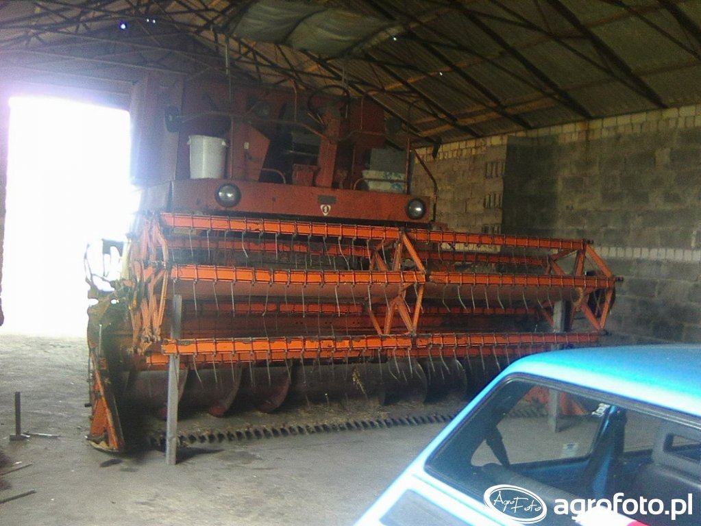 Kombajn Bizon Z056 w trakcie postoju w magazynie. Ten model, znany z charakterystycznej czerwono-pomarańczowej kolorystyki, wyposażony jest w heder z motowidłami, co wskazuje na jego przystosowanie do koszenia zbóż. Bizon Z056 posiada silnik wysokoprężny o mocy 100 KM, co pozwala na efektywne przeprowadzanie prac żniwnych. Zbiornik na ziarno o pojemności 3 200 litrów umożliwia dłuższą pracę bez konieczności częstego opróżniania. Maszyna ta, będąca symbolem polskiego rolnictwa, zdolna jest do omłotu z przepustowością aż do 5 kg/s, co czyni ją niezwykle wydajną w pracy na polach zbożowych.