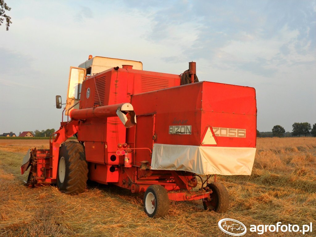 Kombajn Bizon Z056 podczas prac żniwnych na ściernisku. Ten charakterystyczny polski kombajn jest wyposażony w silnik o mocy 120 KM, który napędza bębnowy system omłotu, zapewniając wydajną pracę w polu. Model Z056 ma zbiornik ziarna o pojemności 2540 litrów oraz heder z motowidłami, co umożliwia efektywne koszenie zbóż. Kombajn widoczny na tle pola złocistych resztek po koszeniu jest przykładem solidnej konstrukcji, która przez wiele lat była powszechnie używana w polskim rolnictwie. Charakterystyczna czerwona barwa podkreśla jego obecność na tradycyjnych polach uprawnych, łącząc praktyczność z wydajnością w codziennej pracy rolnika.