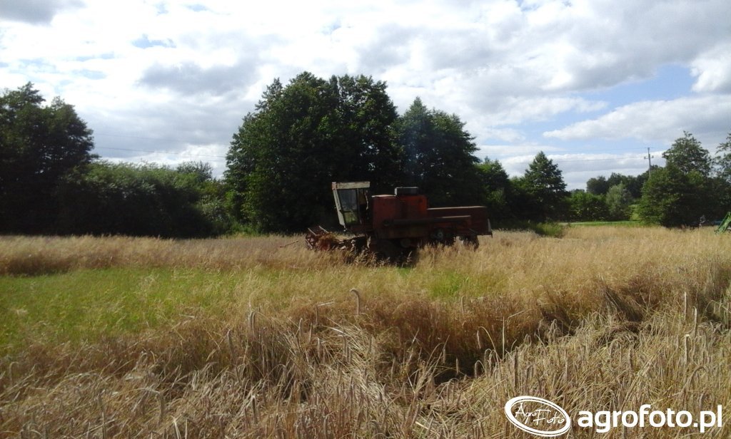 Kombajn Bizon Z056 podczas prac żniwnych na polu zboża. Wyposażony w heder z motowidłami, kombajn ten jest przystosowany do efektywnego koszenia zbóż takich jak pszenica czy jęczmień. Maszyna napędzana jest silnikiem SW 400 o mocy 100 KM, co zapewnia odpowiednią wydajność do pracy na średnich i dużych polach. Pojemność zbiornika na ziarno wynosi 2 500 litrów, umożliwiając nieprzerwaną pracę przez dłuższy czas bez konieczności częstego rozładunku. System omłotu bębnowy gwarantuje skuteczne oddzielanie ziarna od reszty rośliny. Na zdjęciu kombajn pracuje w naturalnym, wiejskim otoczeniu, w otoczeniu drzew, wykonując rutynowe czynności związane ze zbiorami.